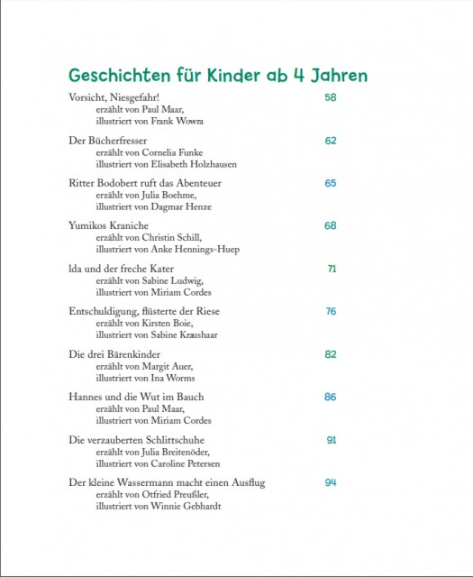 Geschmäcker sind verschieden, das liest du schon im Vorwort. Dementsprechend ist Vielfalt auch die Devise für dieses Vorlesebuch, oder genauer: Vielfalt plus Qualität. Denn die Geschichten für Kinder zwischen drei und fünf Jahren sind sehr sorgfältig ausgesucht. Sie nehmen dich mit in märchenhafte Welten zu Rittern, Drachen und Gespenstern oder in Alltagswelten zu verfressenen Katern und entgleisenden Geburtstagsfeiern („Spaghettimonster“). Du reist in fremde Länder, triffst Fantasiegestalten oder liebenswerte Tiere wie Eisbär Lars und seine Freunde. James Krüss reimt über einen „blauen Autobus“ und Paul Maar erzählt von einem Ort mit „Niesgefahr“. Es geht um Wut und Freundschaft, Abenteuer, Mut und viel, viel mehr Horizonterweiterndes. Wo die Experten der Zeitschrift ELTERN all diese schönen Geschichten gefunden haben, kannst du im Quellenverzeichnis am Ende nachschauen. Vielleicht führt dich das ja zu noch mehr Vorleseschätzen. Vorerst aber ist dieses Buch zum Vorlesen und Immer-wieder-Lesen definitiv Schatz genug für viiiiieeeele tolle Vorlesezeiten.