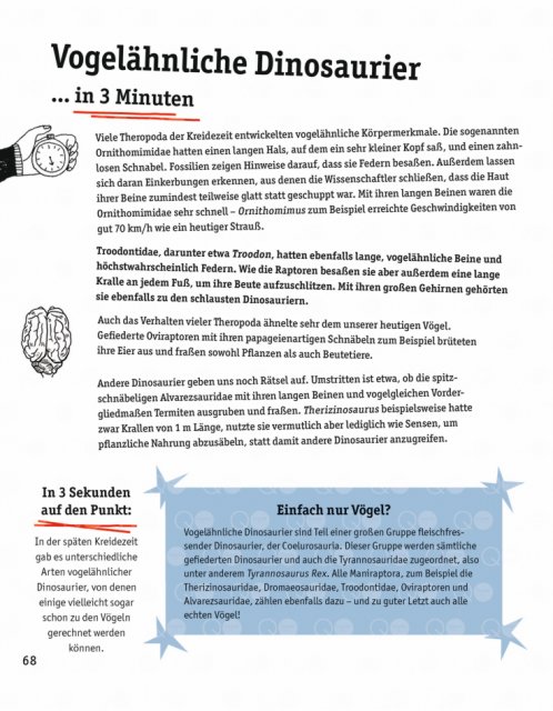 „Schnell in 3 Minuten die wichtigsten Fakten für dich“ – so lautet der Untertitel zu diesem Wissen-to-go-Sachbuch für Kinder. Mit anderen Worten: Hier geht es mit ebenso kurzen wie leicht verständlichen Erklärungen direkt zur Sache. Für alle, die es noch eiliger haben, gibt es sogar noch einmal Mini-mini-Zusammenfassungen, die zu lesen nicht länger als drei Sekunden dauert. Dazu findest du auf jeder Seite des etwa DIN-A4 großen Hardcovers erklärende Illustrationen und coole Missionen zum Selbst-aktiv-Werden. Auf diese Weise erschließt sich dein Kind im Handumdrehen faszinierendes Wissen zu den Giganten der Erdgeschichte. Zum Beispiel lernt es alles Wichtige über geologische Zeitalter und Evolution, zur Welt des Juras und der Kreide, über den Beginn des Lebens und über Fossilien. Es erfährt, was ein Paläontologe ist, was ein Spinosaurier und was sich hinter dem Begriff „Pangäa“ verbirgt. Und das alles zack, zack, zack!