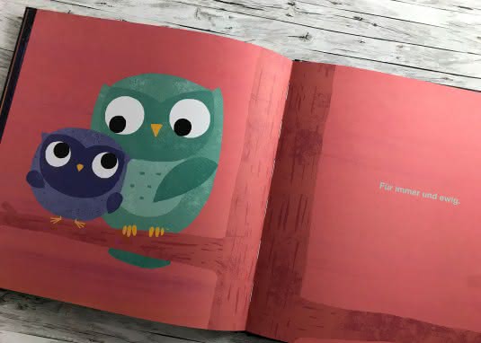 Anfangs taucht der Sonnenuntergang alles in ein sattes, warmes Orange. Dann wird es Seite für Seite dunkler, bis die beiden Eulen vor einem sternenbesetzten Nachthimmel auf ihrem Ast sitzen und eine kuschelige Liebhabe-Atmosphäre herrscht. Vor diesem einfach gehaltenen Hintergrund sind die drolligen Eulen mit ihren großen, ausdruckstarken Kulleraugen ganz klar die Hauptattraktion. Die wie aus Schablonen zusammengesetzten Eulen sehen unheimlich süß aus, vor allem die kleine, runde Eule Flo. Und sie zeigen, wie man mit einfachen Formen einen großen Effekt erzielen kann. Die Farbe des Gefieders passt dabei immer zur Schrift: Die Fragen vom kleinen Flo sind blau und nach seinem Farbwechsel lila, antwortet der türkise Flügge ist die Schrift türkis. Praktisch! So findest du dich im Gespräch leicht zurecht. Mit fettgedruckten Großbuchstaben werden außerdem emotionsreiche Ausrufe sowie jedes „Miep!“ hervorgehoben. Das alles sorgt beim Anschauen und Vorlesen für schmunzelnde Augen und ein wohlig seufzendes Herz!