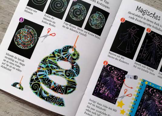 Lust auf Farbe, Kreativsein und ein wenig Magie? Dann schau dir mal die Beschäftigungsbuchreihe „Kreative Kratzkunst“ an. Hier kannst du nur mit einem Holzstift bunt leuchtende Bilder auf schwarzen Karton zaubern. Dazu gibt es ein inspirierendes Anleitungsbuch mit den ersten Schritten und konkreten Ideen. Wie wäre es zum Beispiel mit einem coolen Bilderrahmen, einem Bild für eine Grußkarte oder einem Cover für ein magisches Zauberbuch? Schritt-für-Schritt-Bilder mit kurzen Anleitungssätzen zeigen dir, wie es funktioniert. Und schon heben sich schillernde Muster in allen Regenbogenfarben effektvoll vom schwarzen Hintergrund ab. Die Lieblingsidee der Leseliebe-Redaktion ist dabei ganz klar das leuchtende Lesezeichen zum Selbernutzen oder Verschenken. Was sonst?!