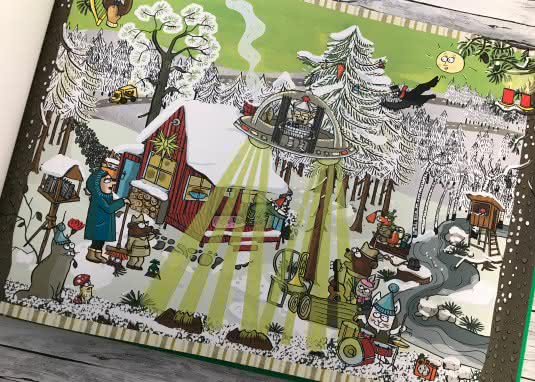 „Übermorgen kommt der Weihnachtsmann. Weitere 24 tolle Weihnachtslieder zum Gucken, Hören und Mitsingen.“ Na, dann los! Schlägst du das Buch auf, entdeckst du zuerst einmal eine CD und eine lustig illustrierte Lieder-Übersicht. Auf der CD findest du – wie sollte es anders sein – alle Lieder aus dem Buch in einer musikalischen Umsetzung. Mal klassisch, mal jazzig, mal im Chanson-Stil, jedes Lied ist wieder neu und überraschend anders arrangiert. Hast du keinen CD-Spieler, kannst du die CD mittels eines Codes übrigens auch einfach herunterladen. Bei der Liedauswahl sind neben deutschen Weihnachtsklassikern wie „Es ist ein Ros entsprungen“ oder „Ich steh an deiner Krippe hier“ auch Weihnachtslieder anderer Nationen, Winterlieder und Popsongs vertreten. Von „White Christmas“ bis hin zu „Mele kalikimaka“ oder „Es wird scho glei dumpa“ strotzt dieses weihnachtliche Liederbuch damit nur so vor musikalischer Vielfalt. Im Buch sind für jedes Lied auf der linken Seite Noten und Texte abgedruckt. Rechts findest du dazu immer ein großes Bild. Und das ist herrlich bunt, schräg und voller witziger Details.