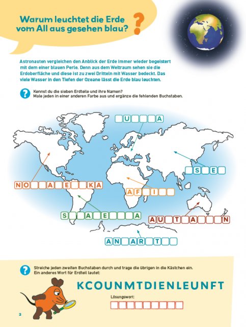 Wie kommt das Salz ins Meer? Wie tief ist die Tiefsee? Und regnet es im Regenwald jeden Tag? Dieses Übungsheft aus der Serie „Frag doch mal die Maus!“ bietet jede Menge spannende Fragen und knifflige Rätsel zum Staunen und Mitmachen an. Dabei machen wir eine Reise durch die verschiedenen Lebensräume unserer Erde: Wir erfahren, warum die Erde aus dem All blau aussieht, welche Tiere im Lebensraum Meer leben, welches die größte Wüste der Welt ist oder welche Jahreszeiten es in den Polargebieten gibt. Eine Doppelseite mit lustigen Maus-Stickern in der Mitte des Heftes runden den lehrreichen Spiele-Spaß gelungen ab.