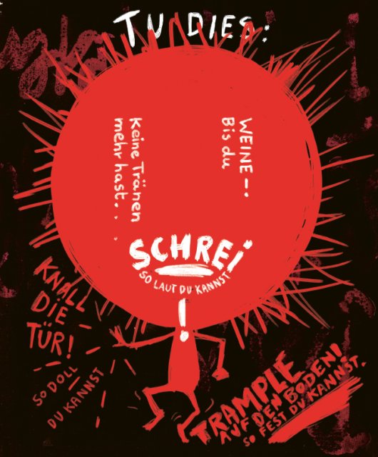 Schon der Einband dieses hochwertigen Hardcoverbuches präsentiert auf einen Blick, worum es hier geht. Ein Kind, das von den riesigen roten Buchstaben fast erdrückt wird, aber gleichzeitig versucht, die „Trennungskacke“ von sich wegzuschieben. Und Regina Kehn gelingt es auch im weiteren Verlauf des Buches, die unterschiedlichen Gefühlslagen von Trennungskindern eindrucksvoll zu illustrieren. Knallige und aggressive Farbtöne wechseln sich dabei mit hellen, freundlichen Farbschattierungen ab. Zudem lockern Bild-Schrift-Collagen, lustige Tierbilder und kreative Mitmachseiten die Textpassagen auf. So wie die „Kritzelkratzelwutbildseite“, wo Kinder einfach ihrem Ärger Luft machen können. Wichtige Sätze springen leuchtend rot hervor und fokussieren zusätzlich auf das Wesentliche im Text. „Du bist nicht allein“ erinnert Kinder beispielsweise daran, dass es immer jemanden gibt, der ihnen zur Seite steht. Das kann neben Verwandten und Freunden auch die „Nummer gegen Kummer“ sein. Vielleicht erkennen Kinder dann am Ende für sich: Auch wenn Trennungen ein Riesenschlammassel sind – sie bieten auch immer Chancen.